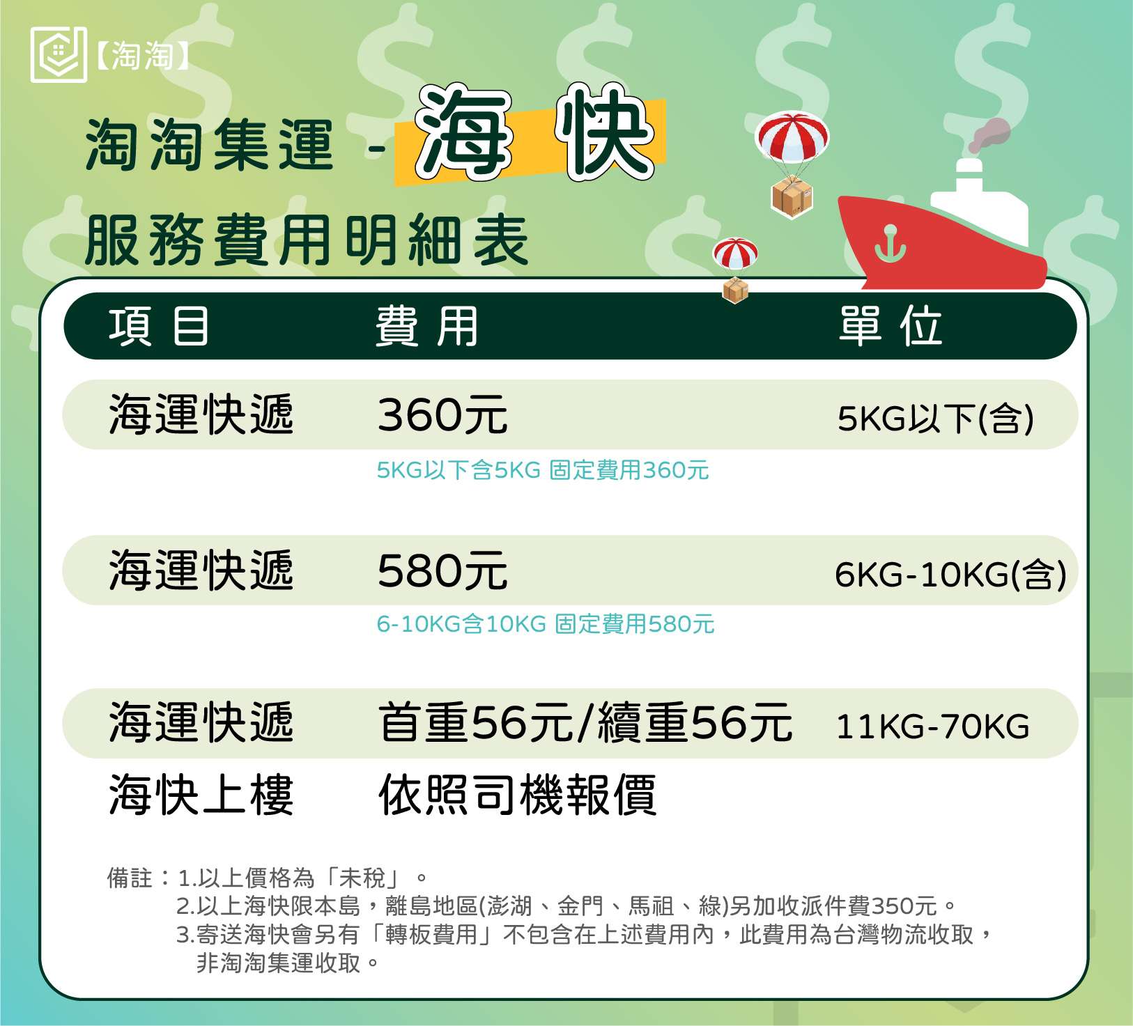 ※寄送海快會有「轉版費用」,不包含在上述運費內,此費用為台灣物流收取,並非淘淘集運洽取的喔!